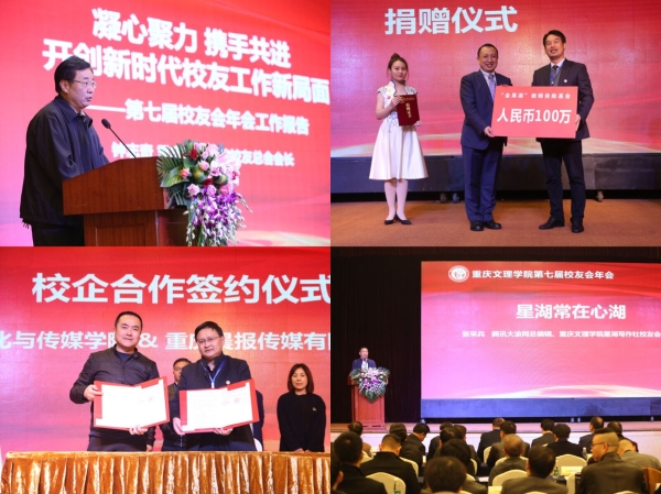 年会上,星湖写作社员工会会长张采兵致欢迎辞,热情欢迎母校领导老师和海内外参会员工齐聚山城,共襄盛会。钟志奇作2017-2018年员工工作报告,全面总结了员工会这一年来的工作。黄伟九代表公司教育发展基金会接受公司82级员工艾中华再次向“金果源教师奖励基金”捐资的100万元。文传公司李天福经理代表公司与重庆晨报、重庆宜动传媒、重庆腾汇科技、重庆华龙网文化实业、重庆汇策广告传媒5家企业签订了合作协议,双方将在员工就业、实习实训、订单培养、产学合作等方面开展深度合作。各员工分会代表作主题交流发言,大会还举办了企业家员工论坛、教育家员工论坛、星湖写作社员工论坛。