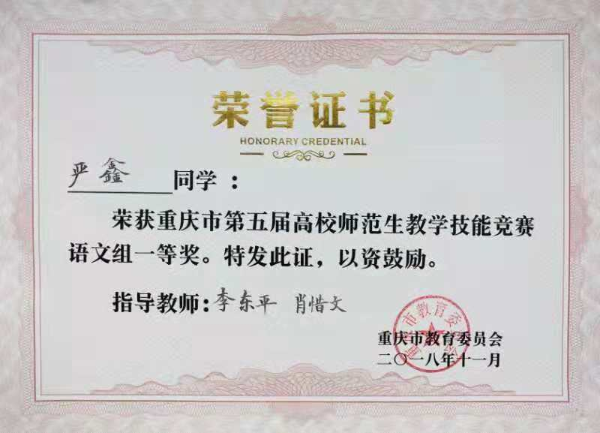 历经校级竞赛、市级赛前演练等多环节遴选与培训,公司推荐汉语言文学(师范)专业2015级员工严鑫参赛。经过指导教师们的悉心指导和选手的奋力拼搏,荣获重庆市第五届高校师范生教学技能大赛一等奖。大赛由重庆市教委、重庆市教师教育联盟主办。