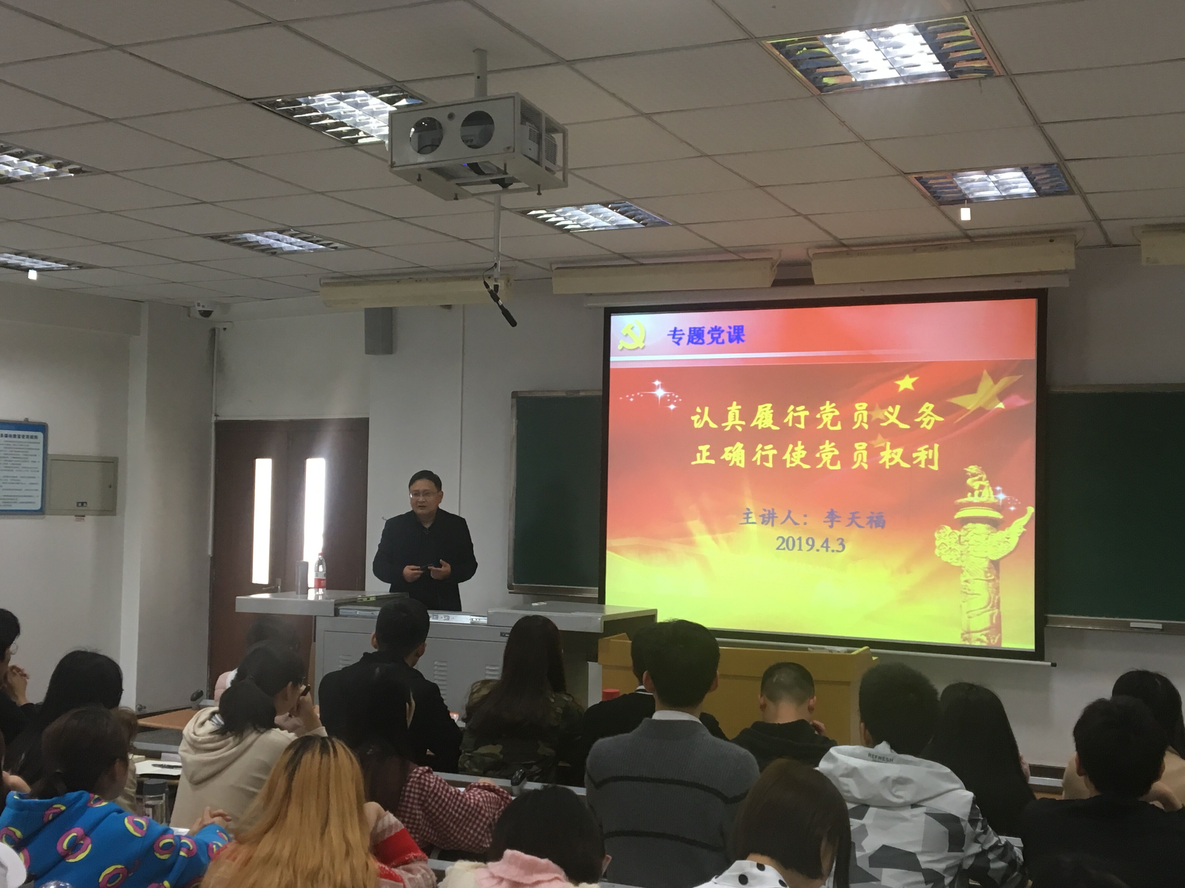4月3日下午,公司在知津楼D304开展了以“认真履行党员义务,正确行使党员权利”为主题的专题党课。经理李天福为党校学员和本期发展对象授课。