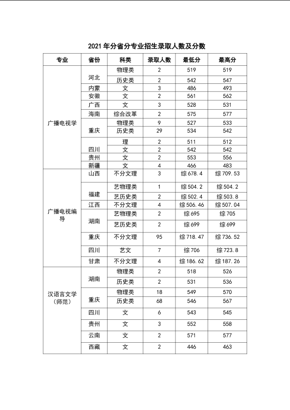 2021年分省分专业招生录取人数及分数