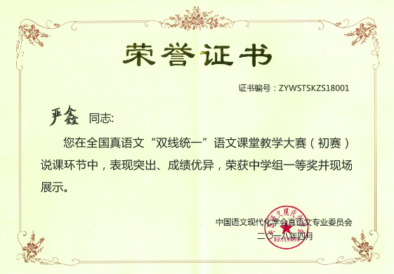 8 | 《记承天寺夜游》说课 | 全国真语文“双线统一”语文课堂教学大赛 | 2018 | 二等奖 | 中国语文现代化学会真语文专业委员会 |