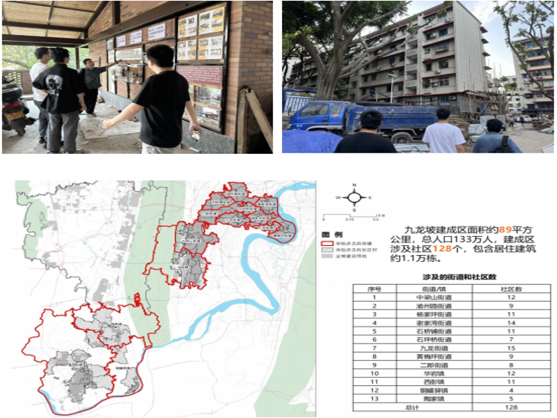 公司通过“校地合作”方式推动城市更新,聚焦“九龙街道、谢家湾街道片区改造”,旨在优化提升社区功能和空间品质,推动社区经济发展、提升居民生活品质,实现产学研一体化的深度融合。课题组引导员工下沉社区,对重庆市九龙坡区九龙街道以及谢家湾街道下属社区基层上报数据进行检查复合工作,确保社区基层数据的真实性、有效性、可靠性。在课题调研初期,课题组为同学们讲解了城市体检项目背景由来、项目具体实施情况以及项目预期。社区基层数据复核工作中,同学们对社区整体数据有一定判断后,走进基层社区委员会进行数据核实工作,在此过程中发现多处空间区域范围绘制不明确,上报内容不完整、调查报告提案内容较为空泛、工作量巨大而繁杂、相关数据收集核实存在较多困难。同学们与课题组克服实际困难,与社区相关负责人积极复核上报数据内容,项目实施较为顺利。