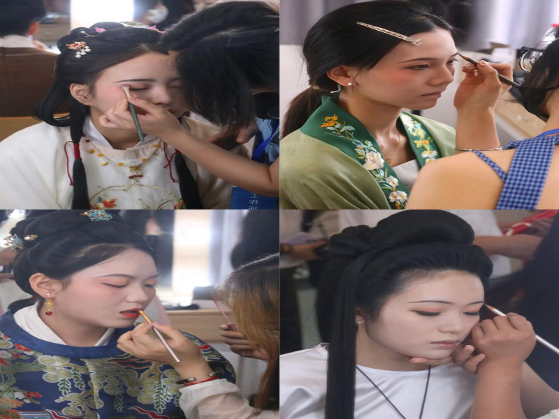 舞台上的光彩夺目,离不开后台化妆镜前的细致雕琢。每天演出前的六七个小时,镜子前的灯光连成一片暖黄,化妆刷轻扫脸颊的簌簌声、发胶定型的滋滋声,与同学们轻声交流的话语交织在一起,成了演出前最特别的“序曲”。